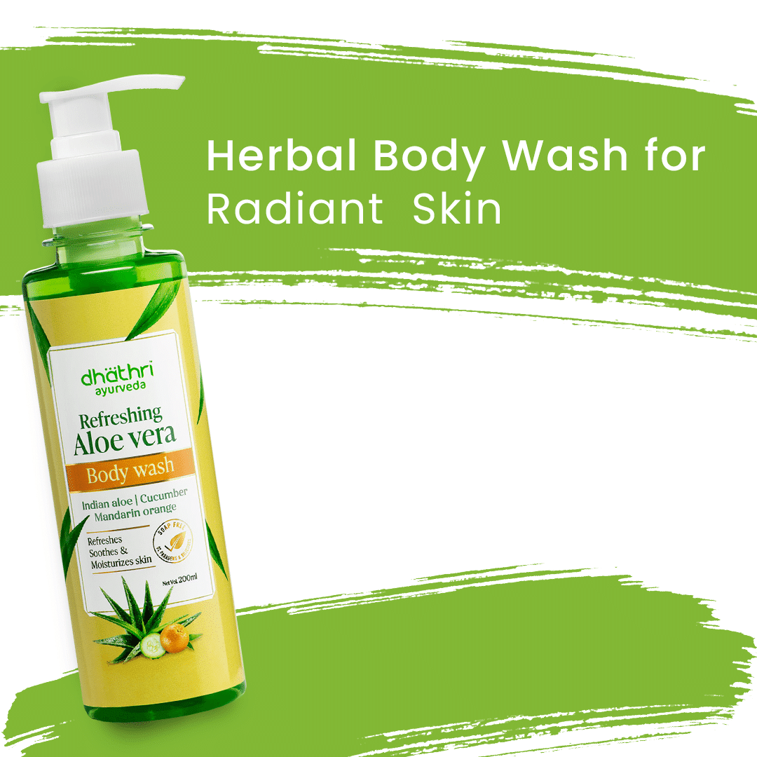 Dhathri Refreshing Aloe Vera Body Wash is a soothing shower gel with the goodness of natural ingredients giving you refreshing showers every single day. This is one of the best body washes for men & women that has a combination of aloe vera and cucumber, both known for hydrating and soothing skin with their cooling effect. These ingredients gives the body a refreshed glow, bath after bath. Mandarin orange is rich in vitamins C and E giving skin a healthy glow. The shower gel also has a Vetiver that holds a multitude of benefits on the skin. From boosting the skin complexion to holding antibacterial properties that reduce rashes, acne, or other impurities, this wonder herb rejuvenates skin and body with every bath. This shower gel holds a mild fragrance of aloe vera and other natural ingredients.