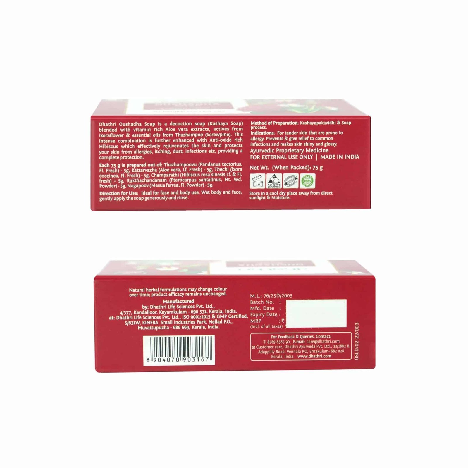 Dhathri Oushadha soap is a revitalizing ayurvedic treat for your skin if you have tender skin prone to allergies or other skin irritations like dust or infection. It is enriched with all the qualities of authentic ayurvedic soap with the rich essence of the natural ingredient red sandalwood, known for deep cleansing. Red sandalwood holds therapeutic properties of cooling down the skin and clearing out impurities from the skin, This is also enriched with vitamin-rich aloe vera extracts, actives from Ixoraflower and essential oils from thazhampoov (Screwpine). It also contains anti-oxide rich hibiscus that rejuvenates the skin. If you are having sensitive skin prone to irritation, this is an ideal choice from our soap range. Altogether Dhathri Oushadha Soap is the best ayurvedic soap formulated with therapeutic herbs that protect the skin from all irritation and infections.