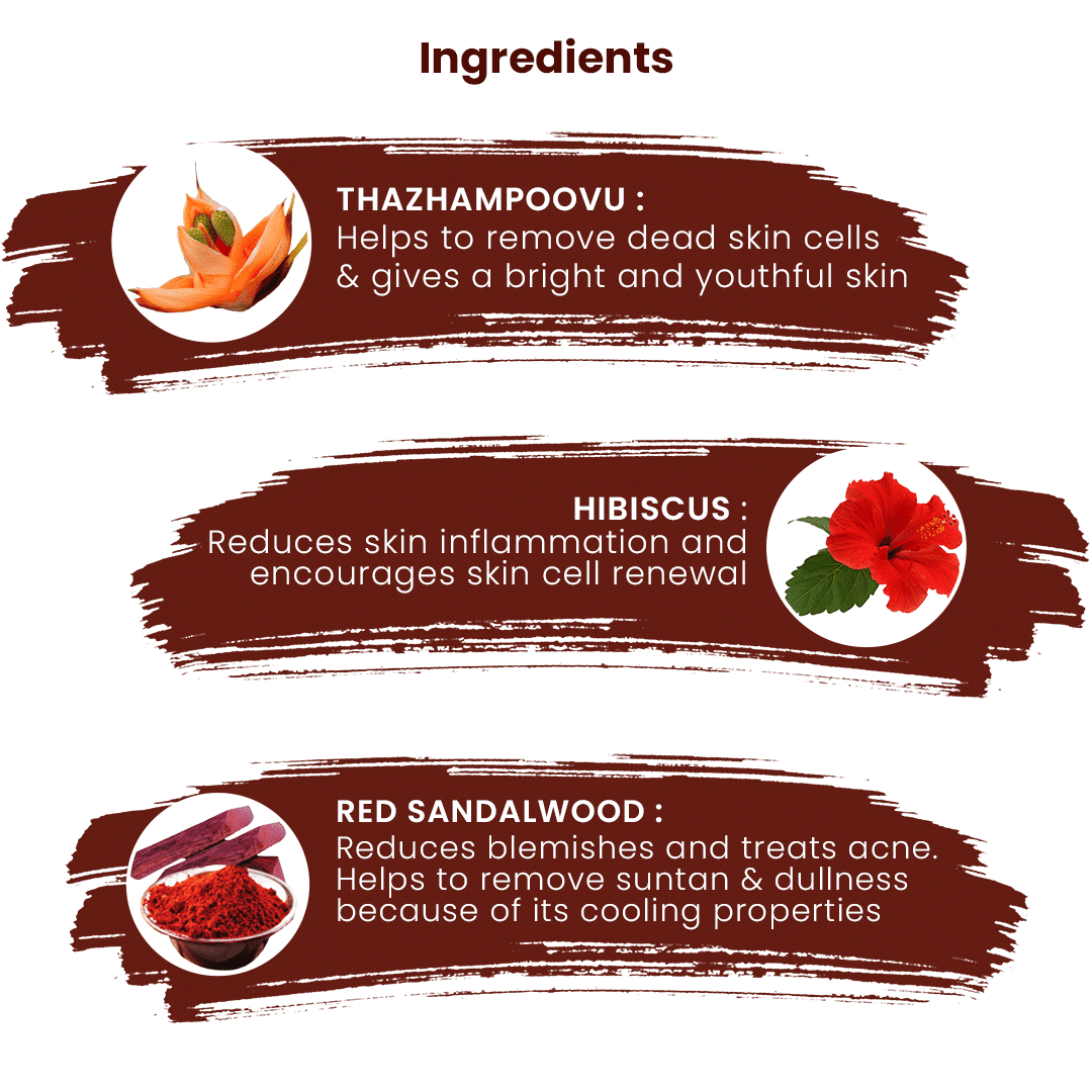 The main ingredients in this soap are red sandalwood, Aloe Vera, Hibiscus, Thechi, and Thazhampoovu, which work together to cleanse, nourish, and protect the skin.