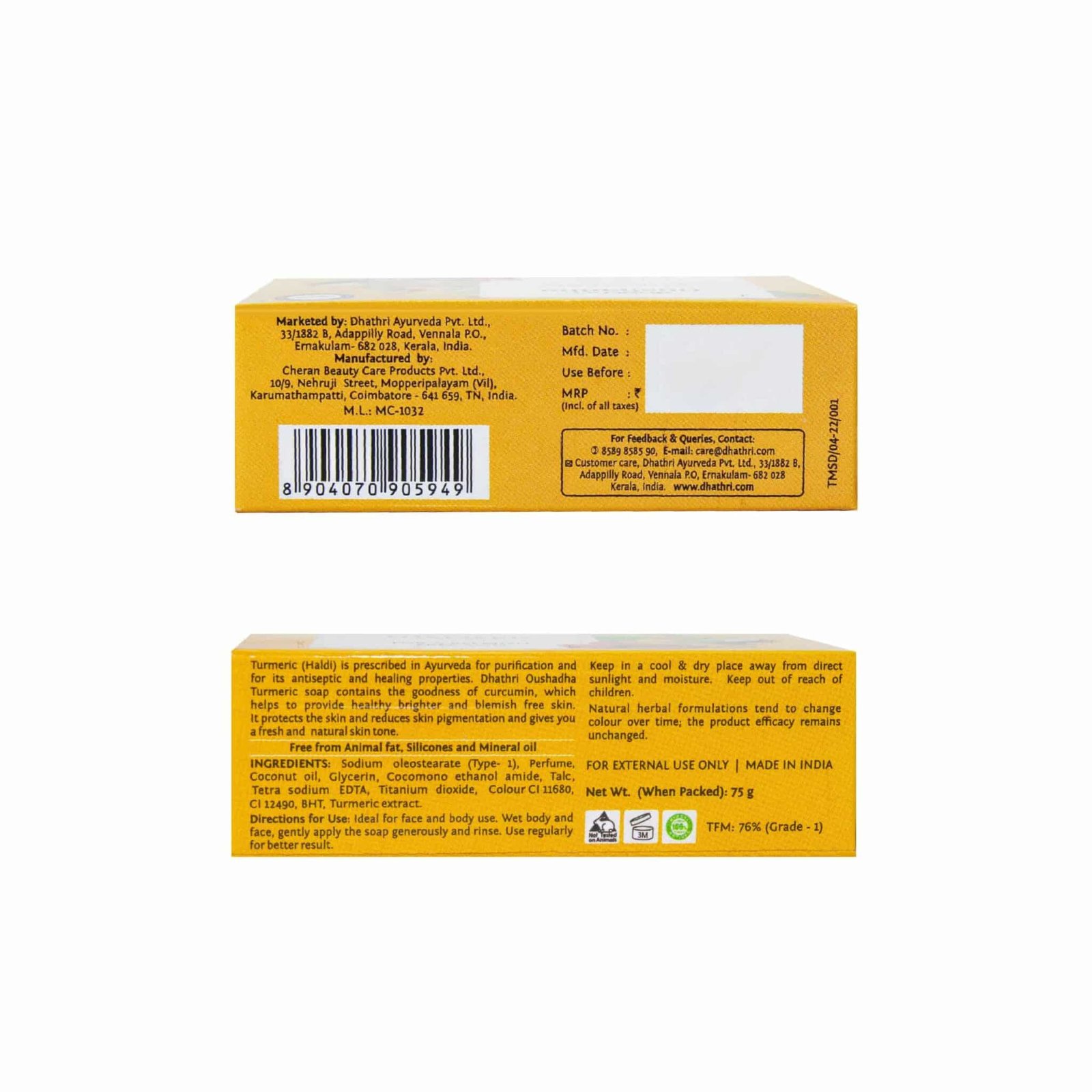 This manjal soap sets itself apart by being free from animal fats, silicones, and mineral oil. The absence of these ingredients ensures that the soap is suitable for a wide range of skin types, including sensitive and acne-prone skin. Animal fats are often used in soap production but can cause dryness and irritation. Silicones and mineral oil can create a barrier on the skin, leading to clogged pores and potential breakouts. By excluding these ingredients, Dhathri Turmeric Soap offers a gentle and nourishing cleansing experience, allowing your skin to breathe and maintain its natural balance.