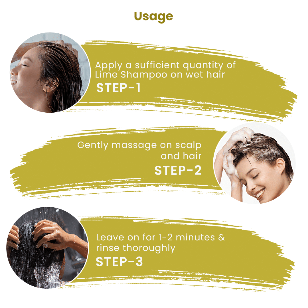 Start by washing your hair thoroughly with water. Take an adequate amount of this natural shampoo in your palm and apply it evenly to your scalp and hair. Apply the natural shampoo to your scalp using your fingertips, working it into a rich lather. Allow the shampoo to remain on your hair for a few minutes to allow the active ingredients to penetrate and nourish your scalp and hair follicles. Rinse thoroughly with lukewarm water, ensuring that no shampoo residue remains. For optimal results, it is recommended to use Lime Shampoo regularly, preferably two to three times a week. Follow up with a conditioner if desired. Enjoy the refreshing experience while Lime Shampoo cleanses and revitalizes your hair, leaving it clean, healthy, and full of natural shine.