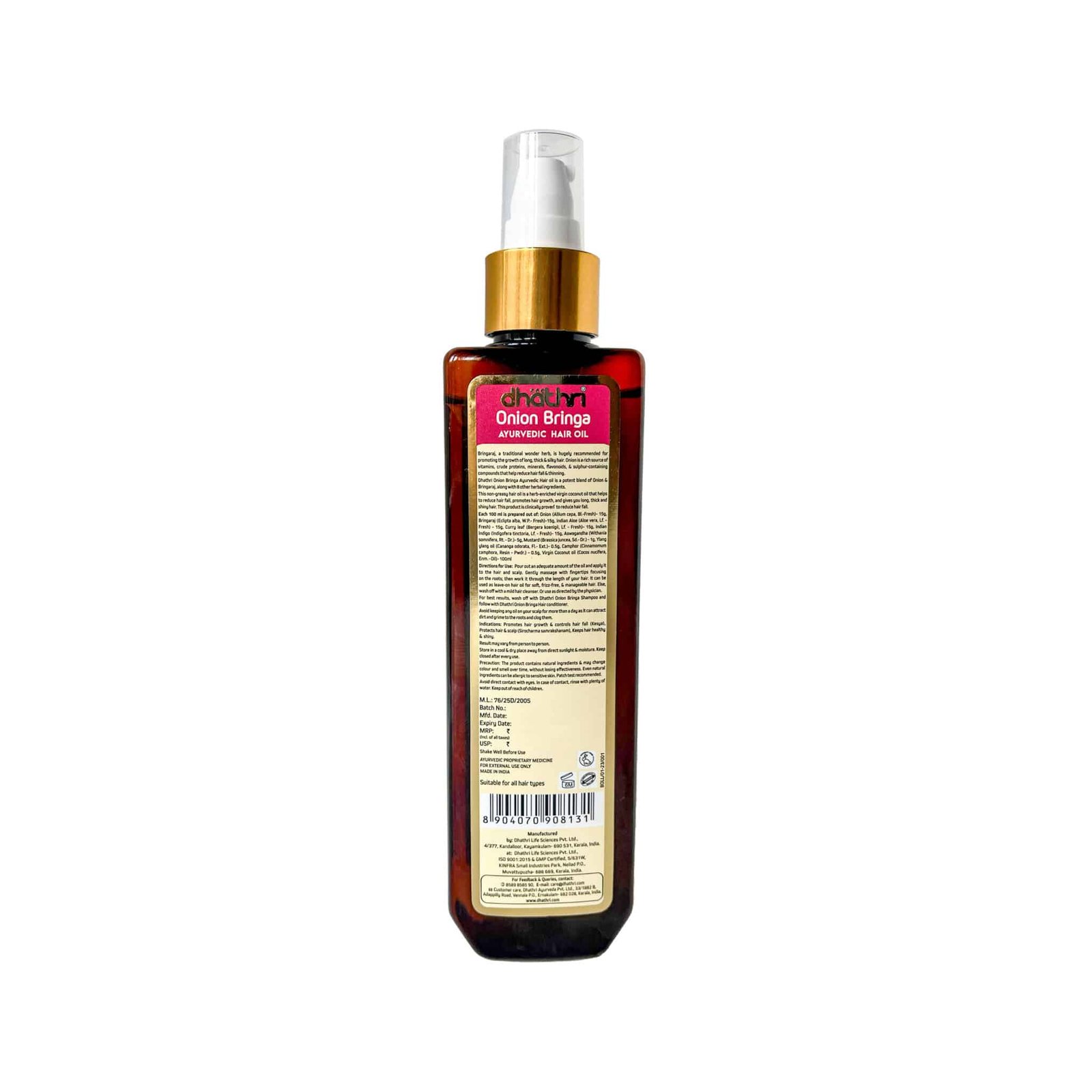 Dhathri Onion Bringa Ayurvedic Hair Oil is formulated with a unique blend of Bringaraj and the nourishing richness of Onion, providing a complete solution for your hair. Bringaraj contains active principles like wedelolactone and beta-sitosterol that actively promote hair growth and control hair fall. Meanwhile, Onion oil is rich in vitamins, proteins, minerals, and antioxidants. It addresses hair thinning, soothes the scalp, and prevents damage to hair follicles. The non-greasy oil, also known as Maha Bringaraj Oil, stands as the best hair oil, promoting long, thick, and shiny hair. Experience the wholesome benefits of onion for hair in every drop.