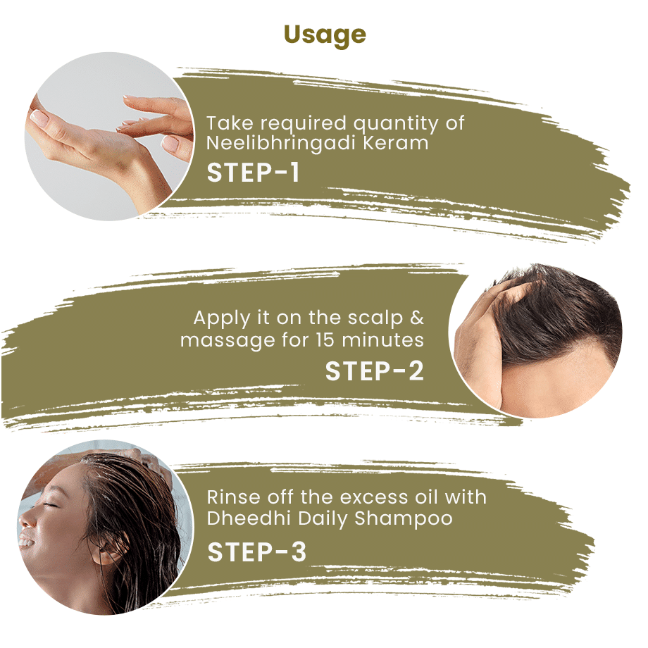 • Take a sufficient quantity of Dhathri Neelibhringadi Keram and apply on scalp and hair