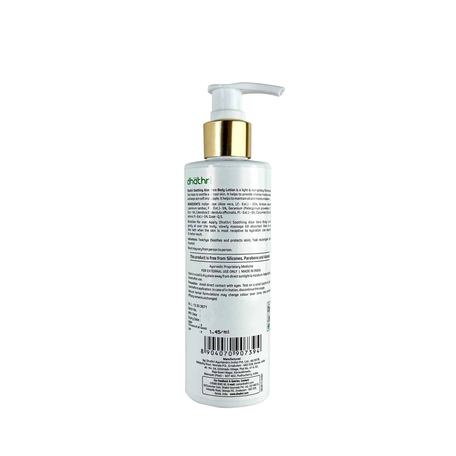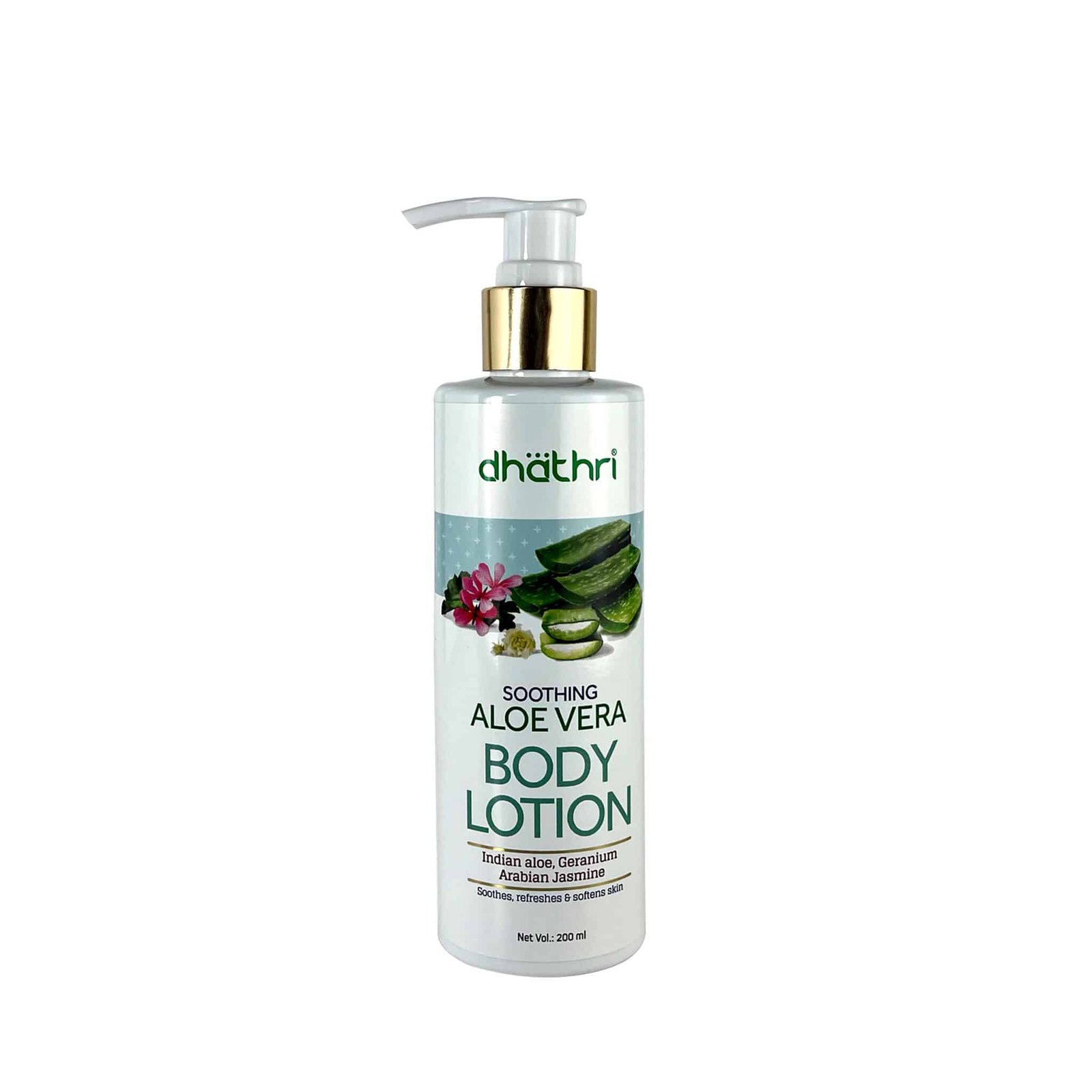 Dhathri Soothing Aloe Vera Body Lotion is a lightweight, non-greasy cream that harnesses the power of aloe vera to soothe and cool your skin, providing an intense moisturization experience while maintaining moisture balance.