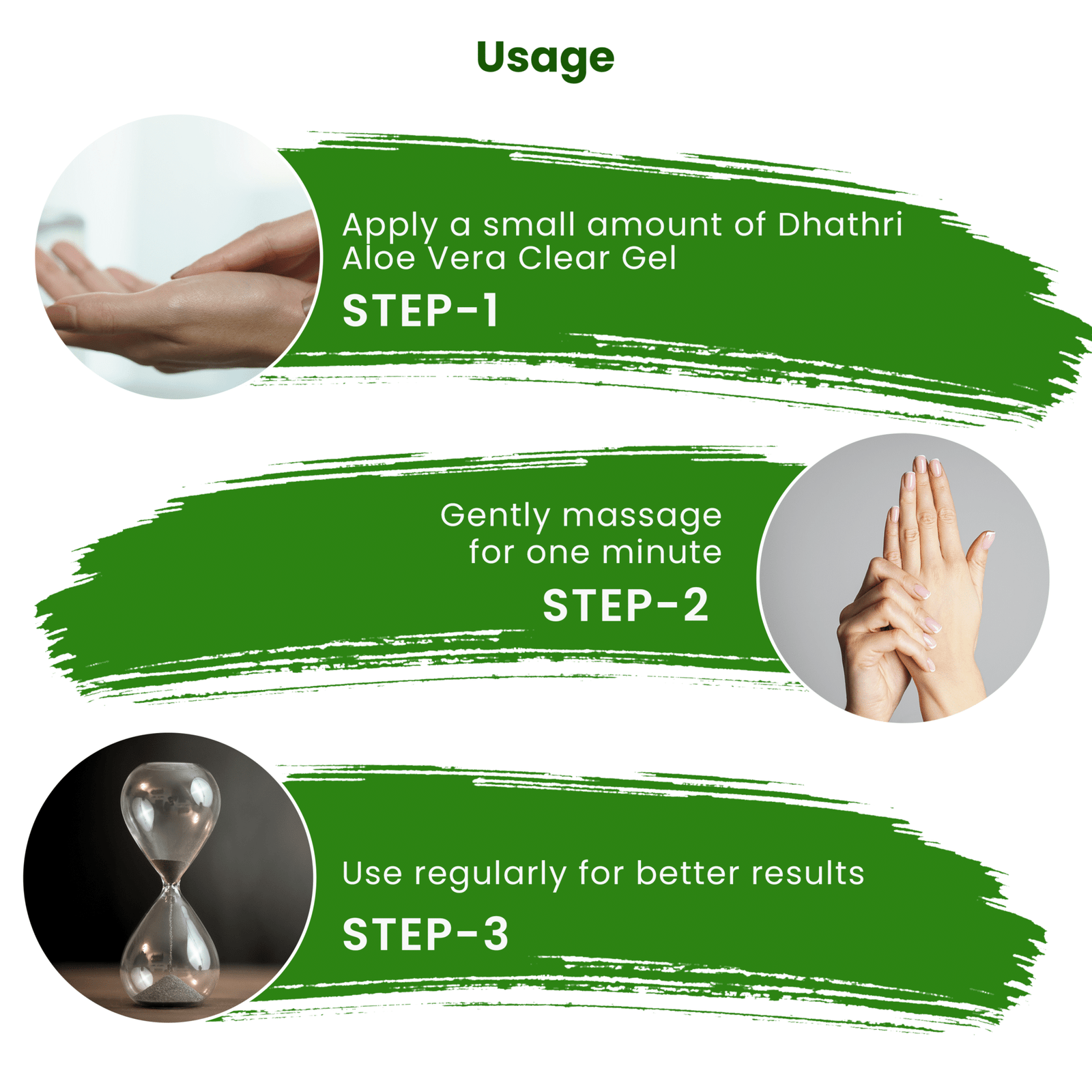 Start by cleaning your face thoroughly. Then, apply a small amount of Dhathri Aloe Vera Clear Gel evenly across your face. Gently massage in circular motions, ensuring complete coverage. This gel can be used as a daily moisturizer or as part of your regular skincare routine.