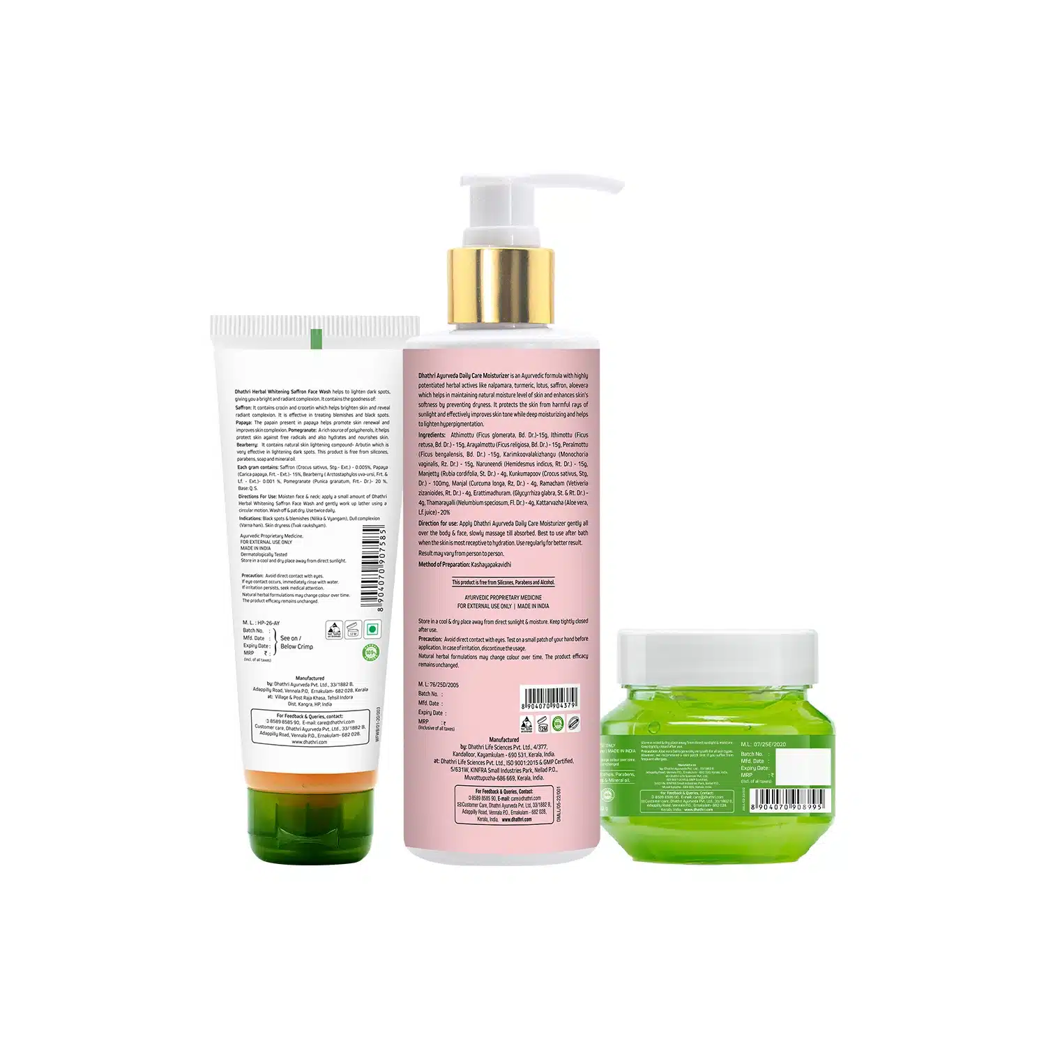Dhathri Skin Essentials is a comprehensive skincare range formulated to enhance your natural beauty and nourish your skin. This collection includes three key products: Saffron face wash, daily moisturizer, and aloe vera gel.