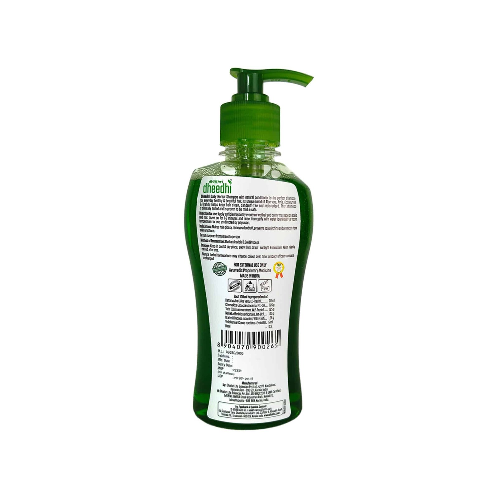 Dheedhi Daily Herbal Shampoo is an ayurvedic shampoo for hair that is designed for daily use. This daily-use shampoo from the house of Dhathri is specially formulated to provide gentle cleansing and nourishment to the hair while keeping it healthy and shiny. Dheedhi Daily Shampoo is made using natural ingredients like Amla, Tulsi, and aloe vera that work together to improve hair texture, prevent hair fall, and promote hair growth.