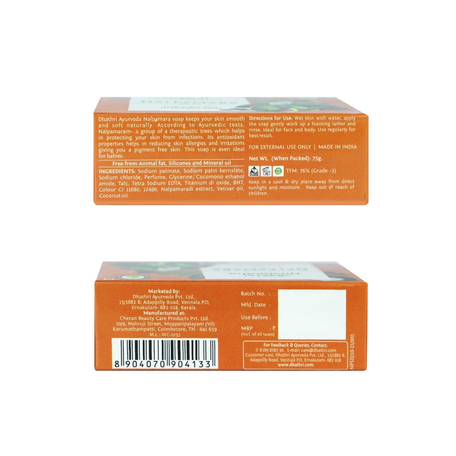 Dhathri Nalpamara Soap is a medicinal combination of four therapeutic trees that shields your skin from infections. It is the best natural soap with antioxidant qualities for reducing skin allergies and infections, giving you rejuvenated skin without pigmentation. Nalpamara Soap is prepared from the sacred Nalpamara tree bark, renowned for its therapeutic properties in Ayurveda.