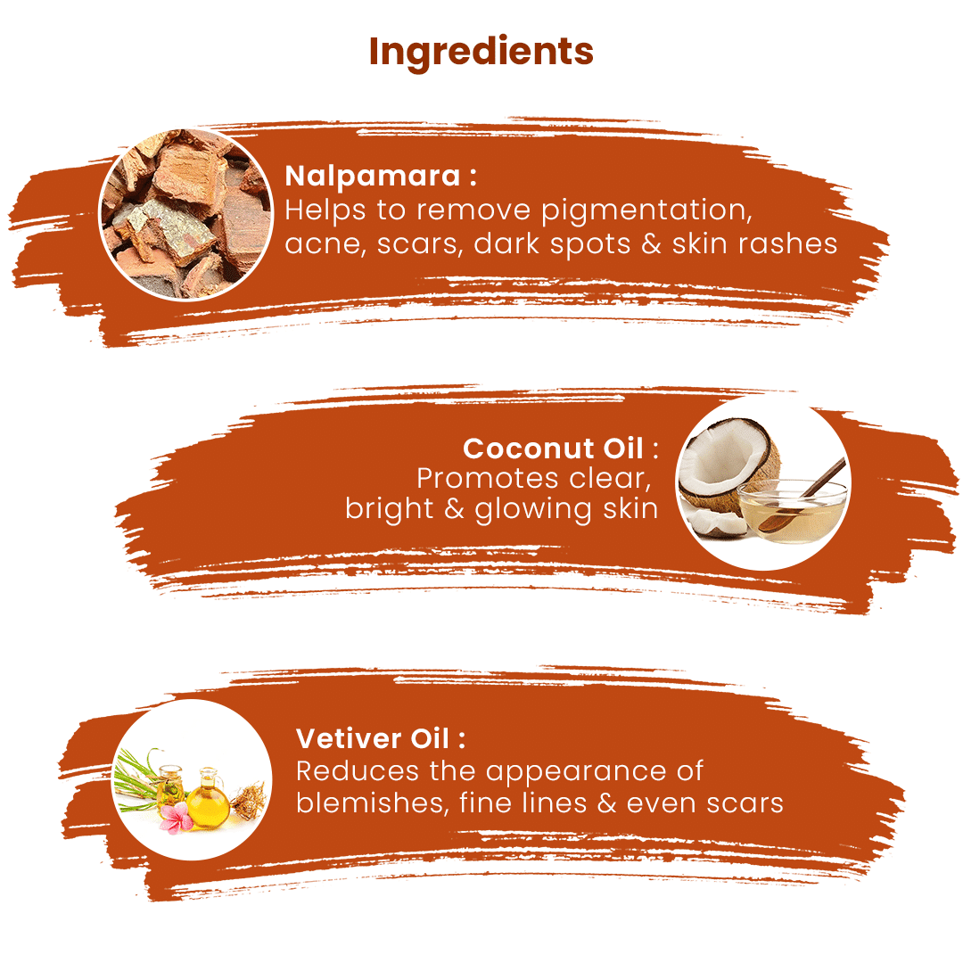 Nalpamara is renowned for its anti-inflammatory and skin-soothing properties, making it ideal for calming irritated or sensitive skin. Another key component is Coconut Oil, a natural moisturiser that deeply nourishes the skin, leaving it supple and soft. With its antimicrobial and antifungal properties, Coconut Oil also helps combat bacteria and fungi on the skin’s surface. Completing the trio is Vetiver Oil, a potent essential oil derived from the roots of the Vetiver grass. Vetiver Oil is valued for its rejuvenating and skin-regenerating properties, effectively reducing the appearance of scars and blemishes. Together, these top ingredients in this Soap form a harmonious blend that revitalizes and restores the skin, unveiling a healthy and radiant complexion.